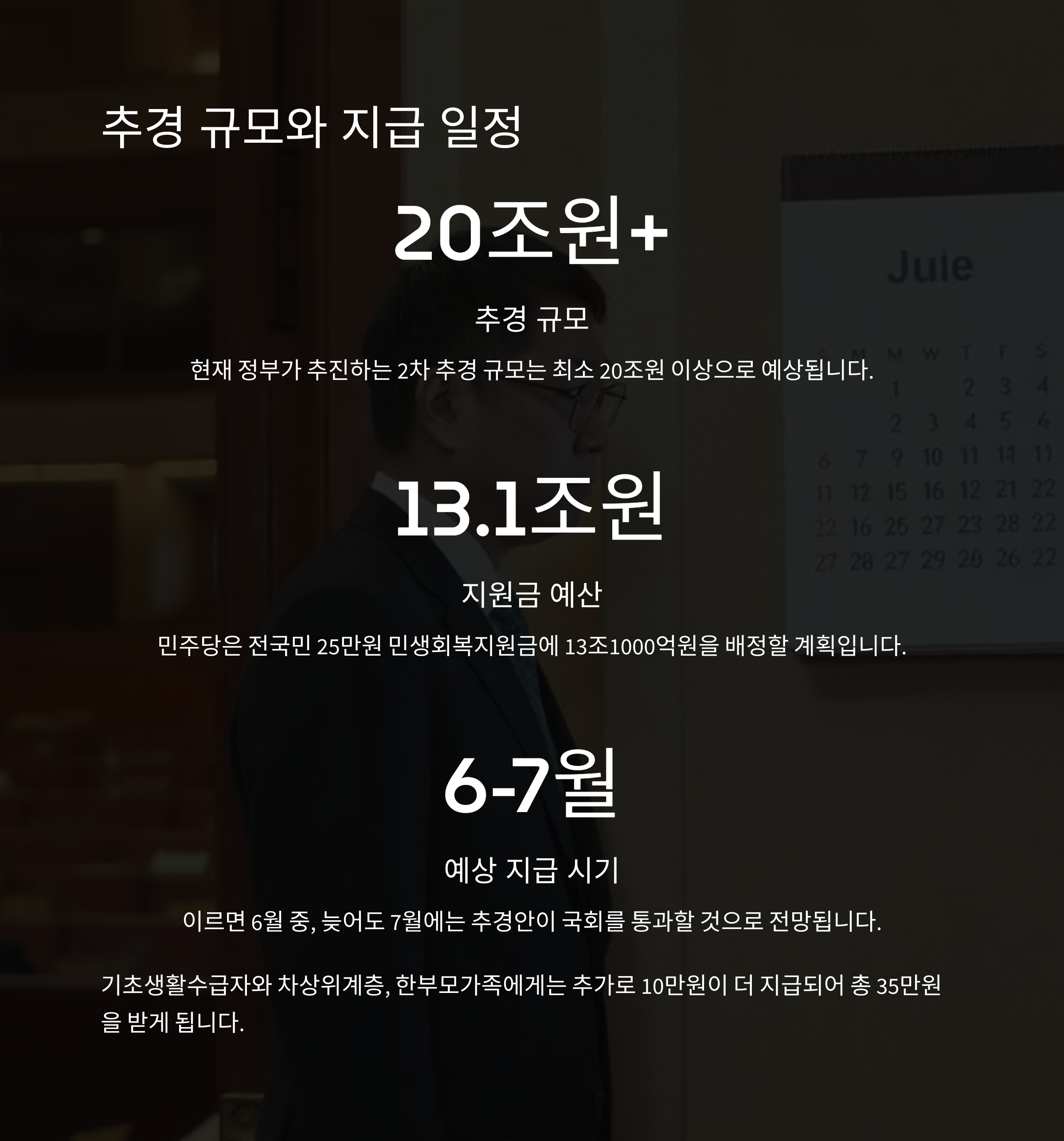 현재 정부가 추진하는 2차 추경 규모는 최소 20조원 이상으로 예상되며, 민주당은 전국민 25만원 민생회복지원금에 13조1000억원을 배정할 계획입니다. 이르면 6월 중, 늦어도 7월에는 추경안이 국회를 통과할 것으로 전망됩니다.