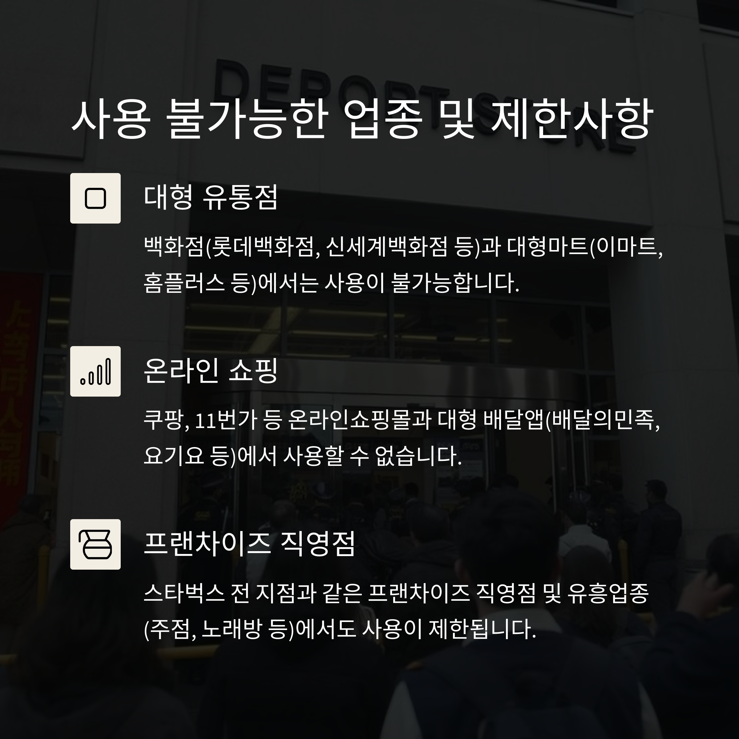 - 백화점, 대형마트, 온라인쇼핑몰 등에서는 사용 불가