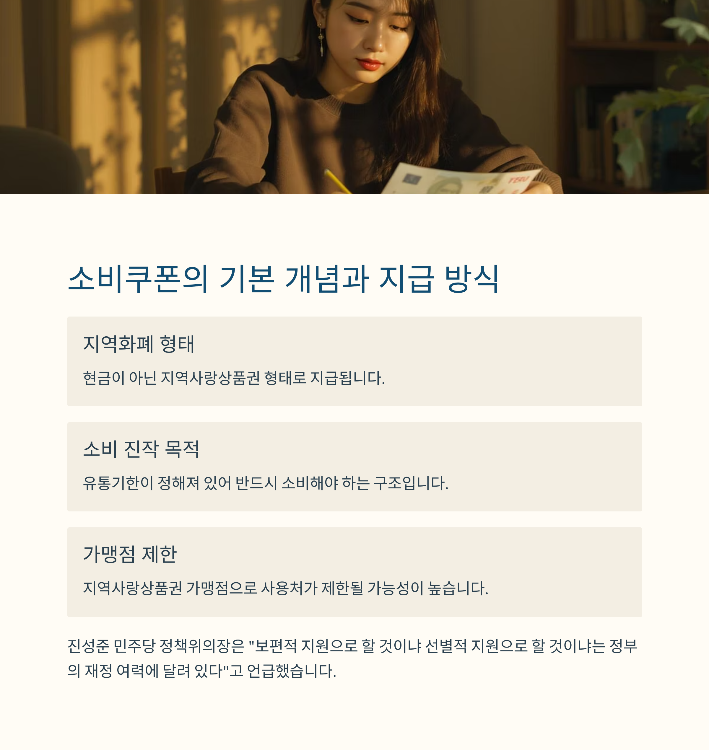 진성준 민주당 정책위의장은 "보편적 지원으로 할 것이냐 선별적 지원으로 할 것이냐는 정부의 재정 여력에 달려 있다"고 말했는데, 이는 전국민 25만원 소비쿠폰 사용처가 지역사랑상품권 가맹점으로 제한될 가능성이 높음을 시사합니다.