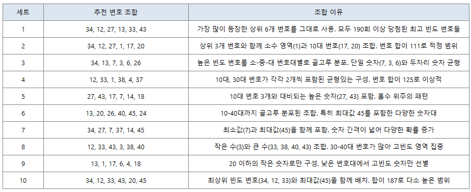 이제 앞서 살펴본 최다 출현 번호들을 활용하여 10개의 추천 번호 조합을 만들어보겠습니다.